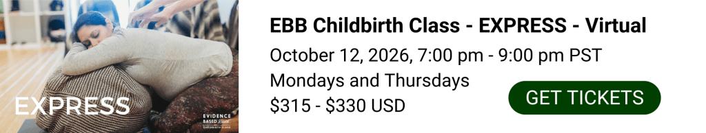 Each class is limited to 6 couples, so don’t wait to schedule. One ticket is good for birthing person and a support person. Classes are 5 weeks in length (6 meetings total) — Express Classes are 3 weeks in length (6 meetings total). Ticket price includes 3 months online access; add $15 for printed workbook.